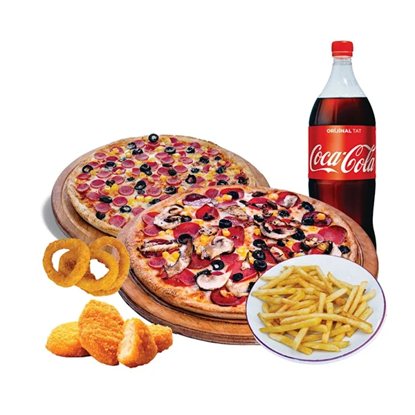 2 Orta Boy Pizza + Çıtır Patates + 4 Nugget + 4 Soğan Halkası + Coca Cola 1 L